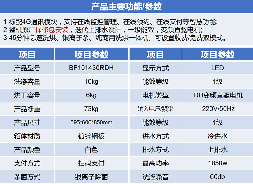 3、45分鐘急速洗烘、銀離子殺、純商用洗烘一體機、可設置收費/免費雙模式。
